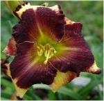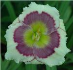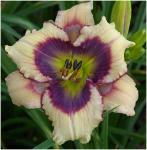 Shaman’s Totem --- 4¾”flowers. 27”scapes. Midseason. Dormant. Recurrent. A bright yellow cream flower with a large raisin plum eye that covers most of the petal and a plum edge. Form is very round and rolled back. The visual impact of this daylily is incredible. Small green heart. Well branched scapes. Fertile.