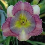 Moon Mage --- 3”flower. 18”scapes. Midseason. Evergreen. Recurrent. A pale lavender rose bicolor with a washed circular eye of violet and blue surrounded by a tiny magenta edging. Petal edges are mostly cream. Small lime green heart. Form is very round and full. Fertile.