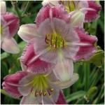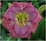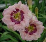 Pixie Prankster --- 2”flowers. 18”scapes. Early midseason. Evergreen. Recurrent. A pale lavender pink flower with a tiny circular eye of magenta that is punctuated by pink flares on the petal midribs. Tiny green heart. Well branched scape carry multiple blooms. Fertile.